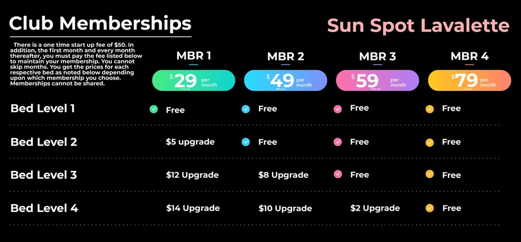 These prices are for the Sun Spot Tanning Salon in Lavalette, WV ONLY.
